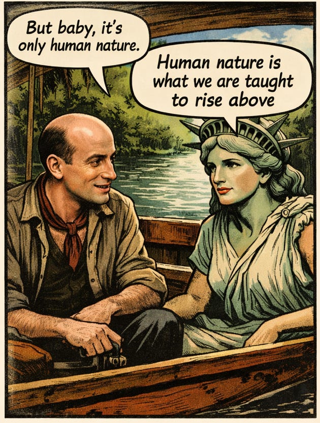No, not hardly. Donald Trump’s Purple Crayon from Hell may sound like a joke or a witticism—and it is, of course. But it’s more than that. What is really at stake here, over all, is what Americans and others come to believe is the truth about human nature, human social and political nature in particular. Are we an autogenic, self-completing species, with enough of an ambit of genuine agency, free will in theological parlance, to change the world for the better? Was Erving Goffman right as a dyed-in-the-wool phenomenologist to say that “social life takes up and freezes into itself the conceptions we have of it”, the clear implication being that it is possible to escape what the AoS project calls Political Malthusianism? Was Katharine Hepburn right back in 1951 to reply to Humphrey Bogart in The African Queen that, “human nature is what we are taught to rise above,” implying as C.S. Forester did in the 1935 book that rising above human nature was possible on a regression-proof basis if enough good and civilized people tried hard and long enough to achieve it?